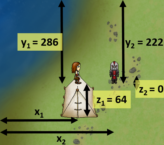In lieu of layers, we need to have a third coordinate to track each entities position in 3D space. On top of that, each entity also needs to have a specified height (z axis) since each entity should no longer be represented by a 2D area but by a 3D volume. Now is not really the time or place for me to go into the details of how collisions work, but suffice it to say (for now) that we can use these two additional pieces of information associated with each entity in the world to properly handle 3D collisions.