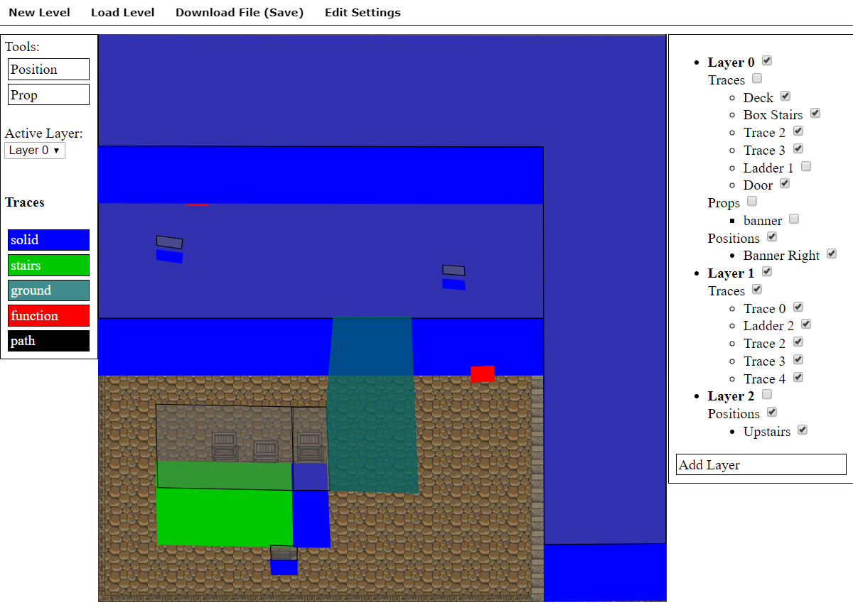 I want to note that the traditional layer-based 2D engine generally nails two of these three. (2) Layer-based 2D engines don't have difficulty with rendering order because layers can be rendered in order and sprites can easily be sorted on the same plane. (We talked about this some in our bonus round post early in the series.) (3) Level editing is natural because the 2D plane of the game world maps directly to the 2D plane of developer's computer screen. (And to manage the complexity of multiple layers, individual layers' visibility can be toggled to only show a subset of all layers at once.)
